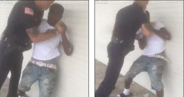 They push against each other in what appears to me an equal fight before the youth grabs the officer in a headlock