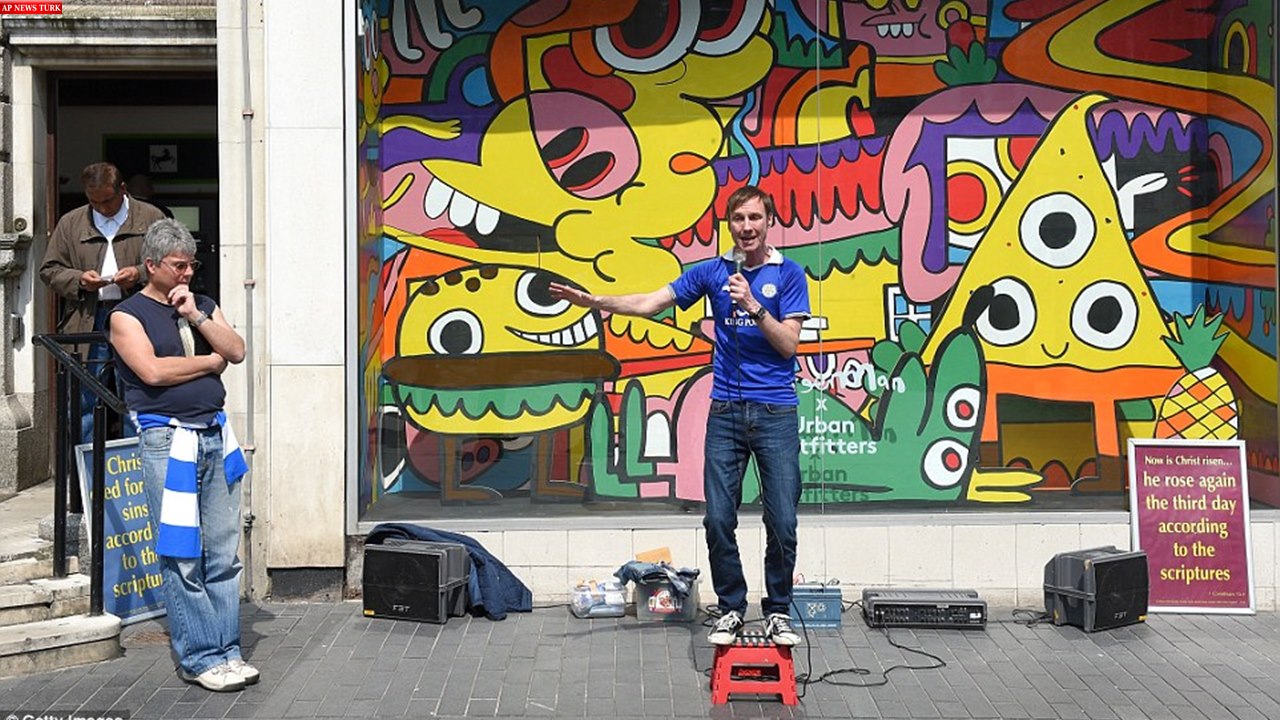 Even street preachers, pictured, got into the spirit of the occasion with one Christian donning a Leicester shirt during his talk