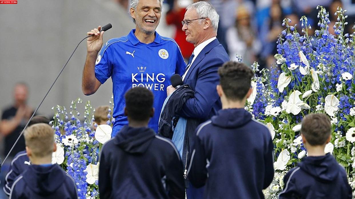 Andrea Bocelli shows off his Leicester City shirt as he performs before the game as Foxes manager Claudio Ranieri looks on