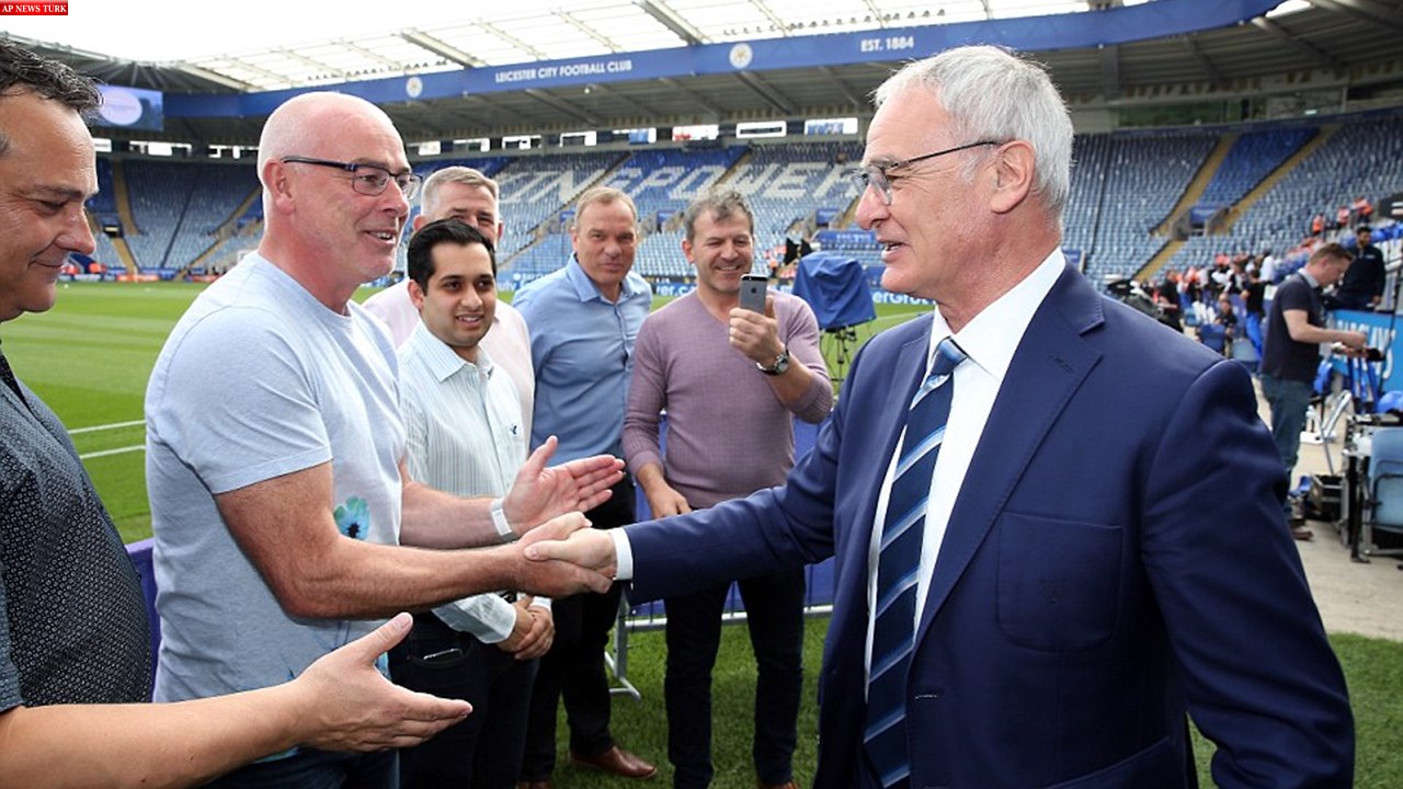 Leicester City manager Claudio Ranieri waves to fans before the match as Andrea Bocelli waits to perform