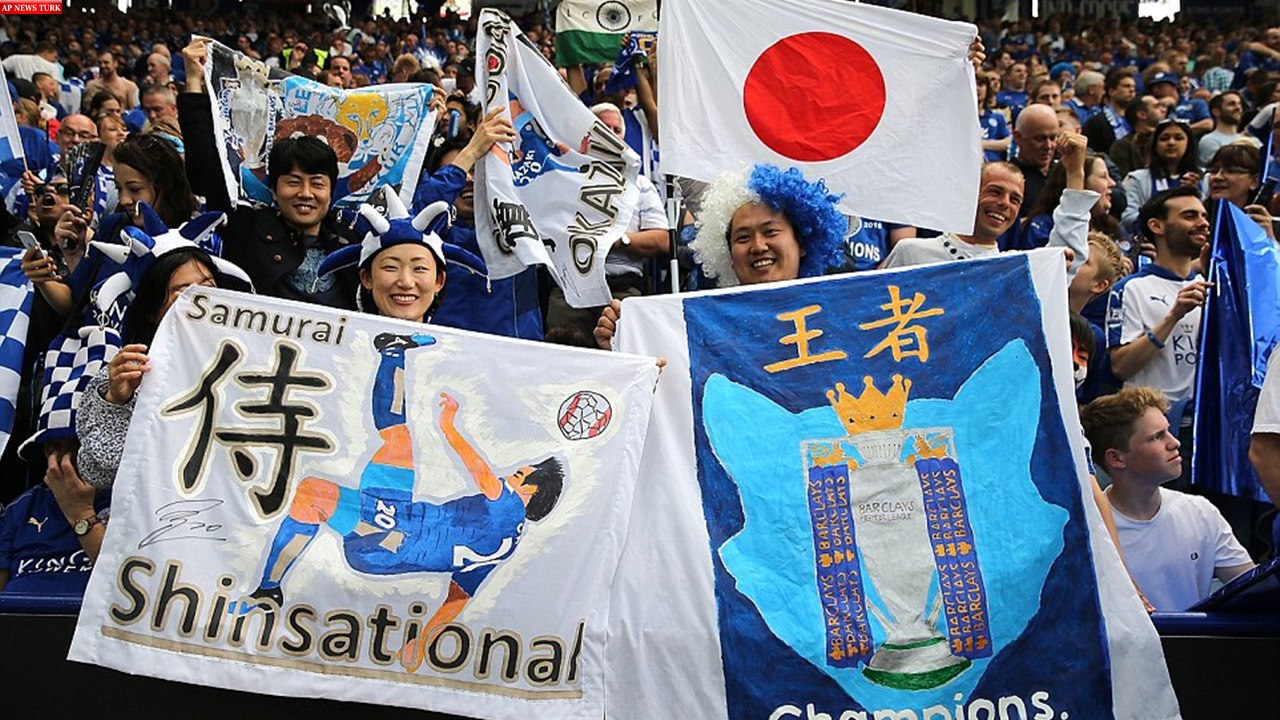 Japanese fans show off a banner honouring Shinji Okazaki of Leicester City at the King Power Stadium on the day they get the trophy
