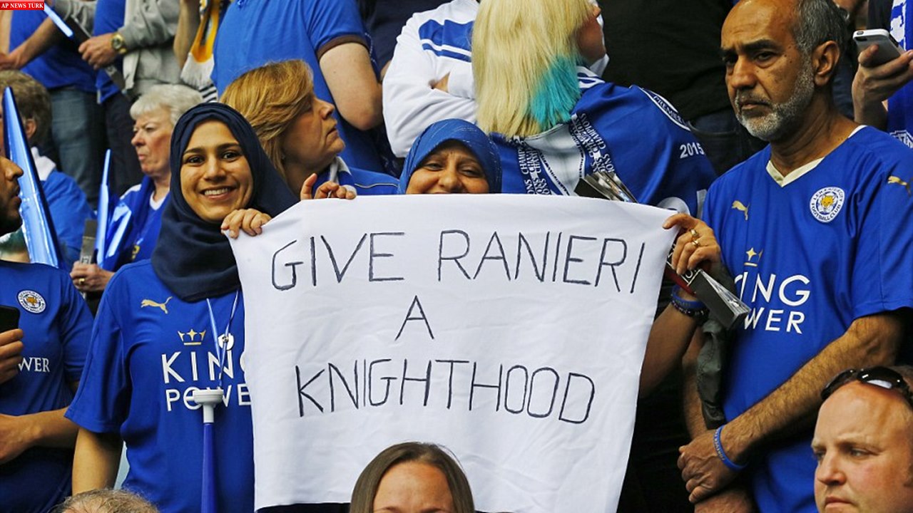 Leicester City fans hold up a banner at the King Power Stadium, saying ‘Give Ranieri a knighthood’ in tribute to the club’s manager