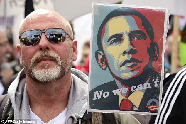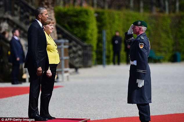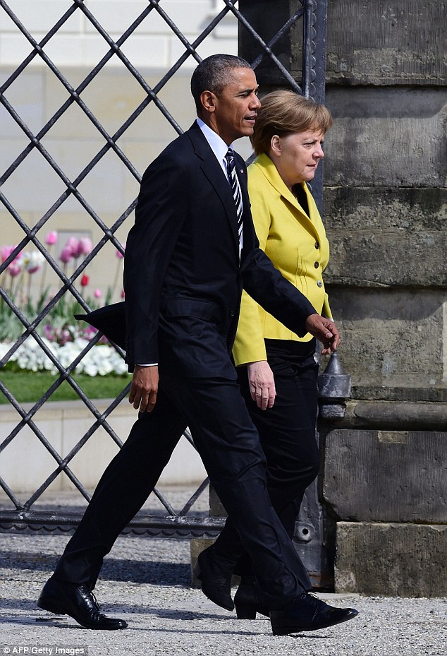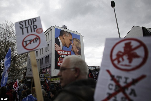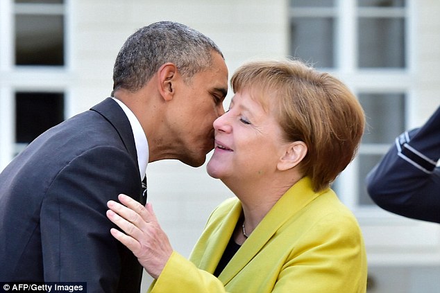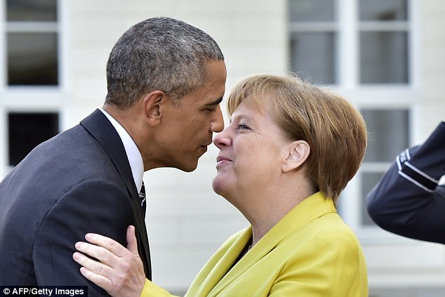 Obama receives a very warm welcome from Merkel as he arrives to lecture ANOTHER country on their best interests: President pushes trade deal after thousands protest