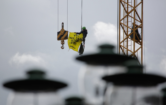 An activist of the environment organization Greenpeace with a banner reading ‘ Yes we can stop TTIP!’ hung from a building crane to show off his poster