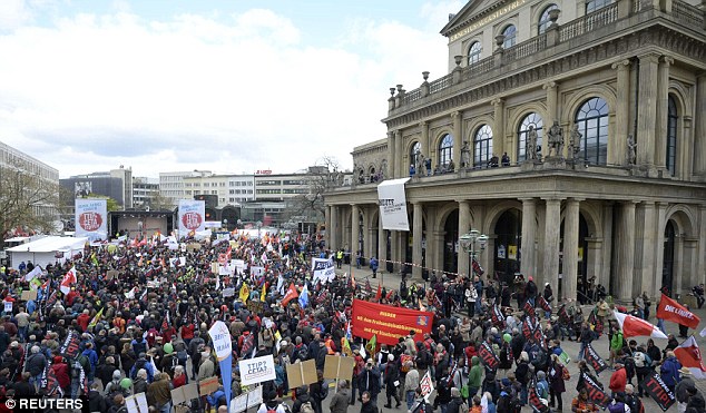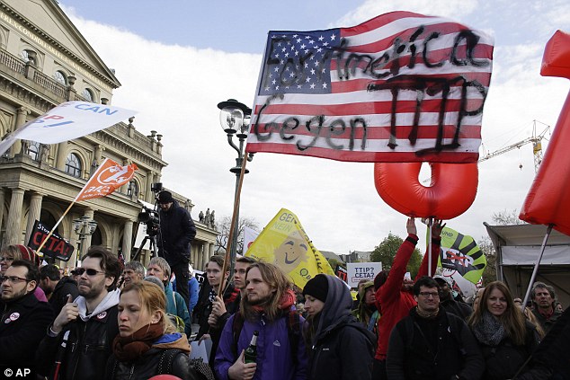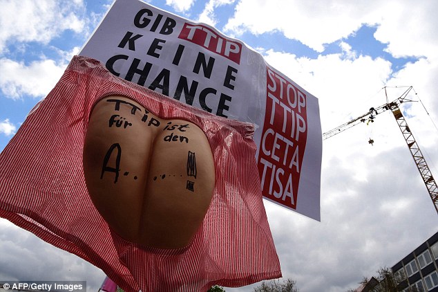 Demonstrators waved flags and carried placards with slogans such as ‘TTIP? Nein Danke (no thanks)!’