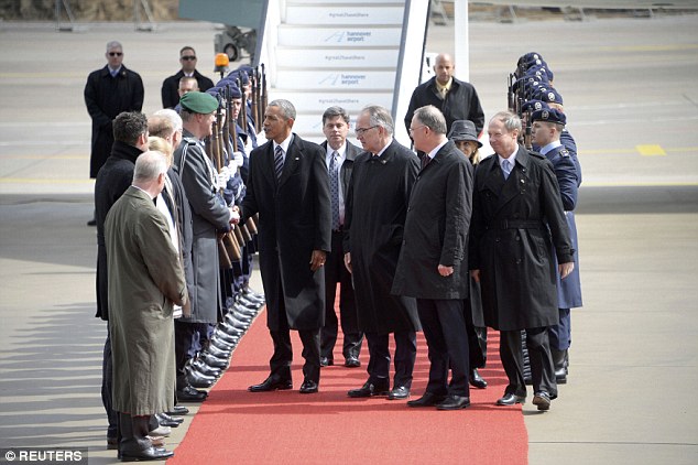 Touch down: President Barack Obama lands at the airport in Hannover, Germany, on Sunday morning