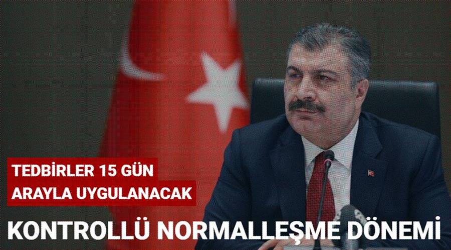 Kontrollü olarak normalleşme döneminin fiilen başladığını belirten Sağlık Bakanı Fahrettin Koca, “Her bir ferdimiz, kırmızı, turuncu ve sarı renkleri maviye dönüştürmek ve mavide tutmak için bir an bile olsa hassasiyetini kaybetmemelidir. 7 günlük vaka görülme sıklığını il bazında yayınlamaya haftalık olarak devam edeceğiz, risk haritası da 15 günde bir yayınlanacak” dedi.