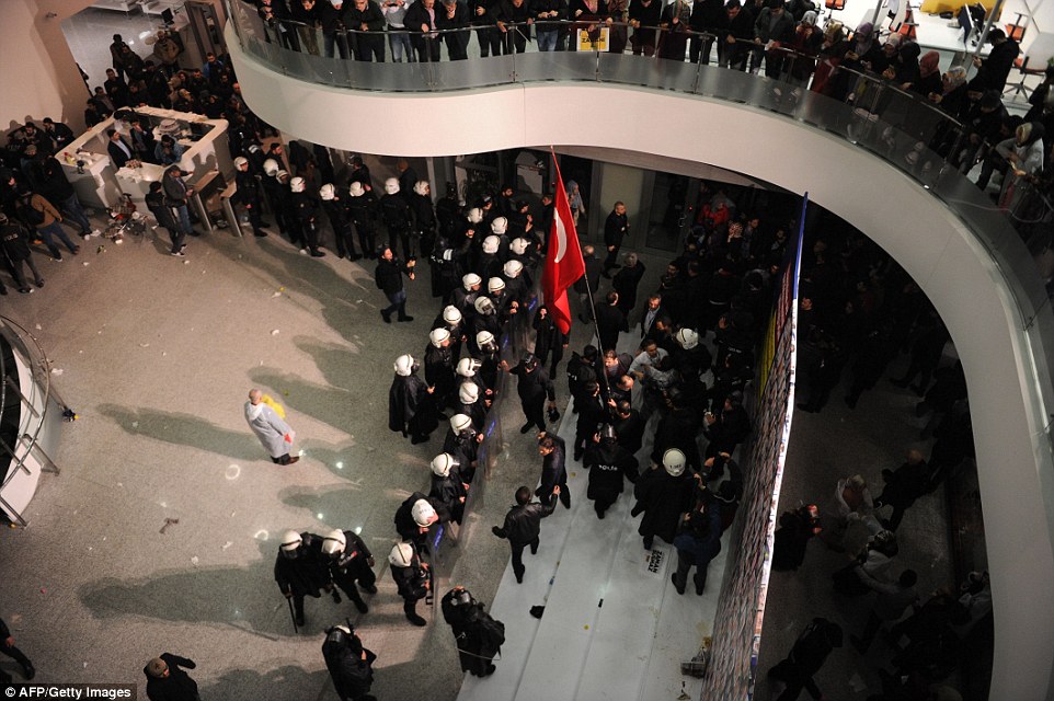 Takeover: Officers storm the headquarters of Zaman in Istanbul, Turkey, and enforce the court-ordered seizure of the daily newspaper
