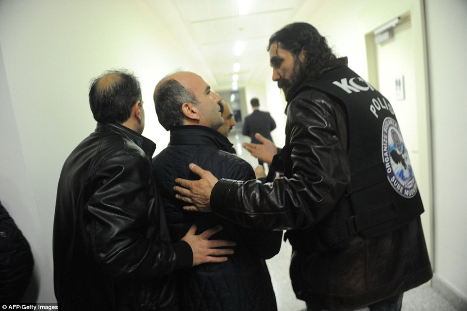 Turkish police officers escort Abdulhamit Bilici (centre), editor in chief of Zaman out of the newspaper`s headquarters on Friday evening