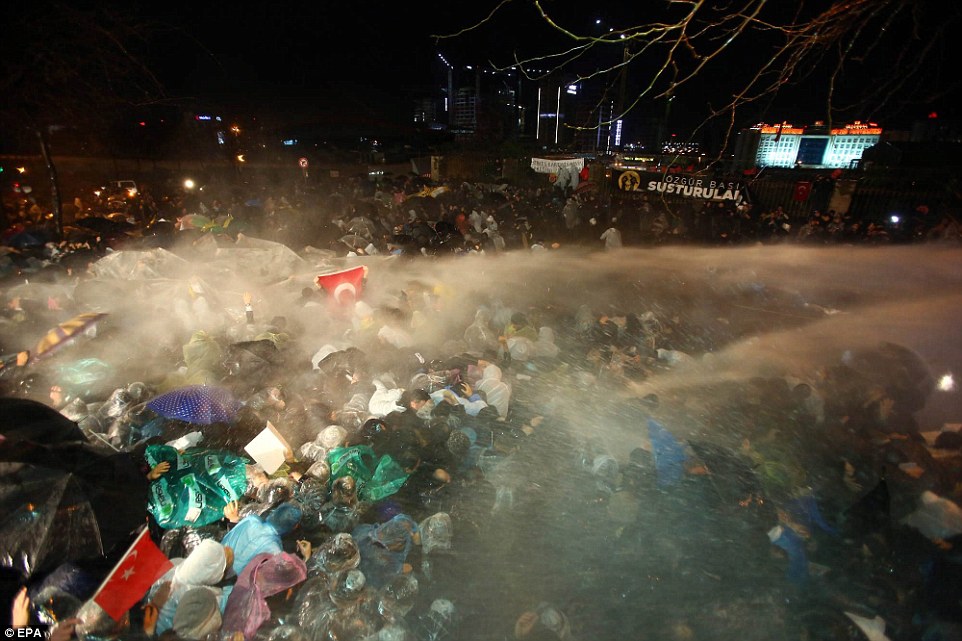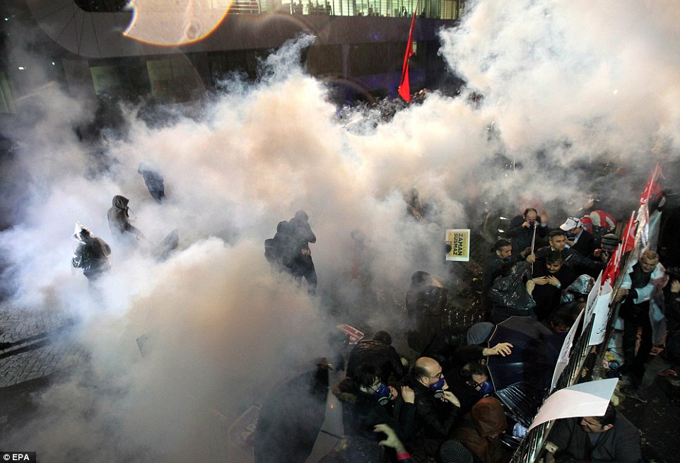 Riot police: Officers disperse protesters at Zaman’s headquarters in Istanbul before they take over control of the daily newspaper
