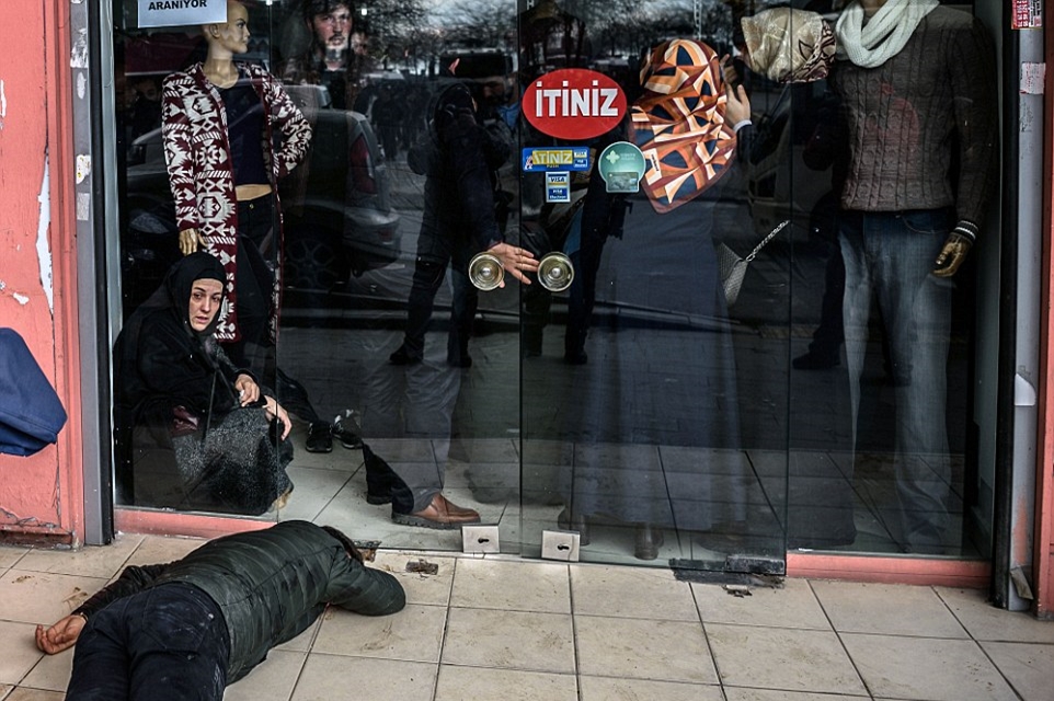 A man lies on the pavement after as women take shelter inside a shop to escape the tear gas being fired by riot police in Istanbul, Turkey