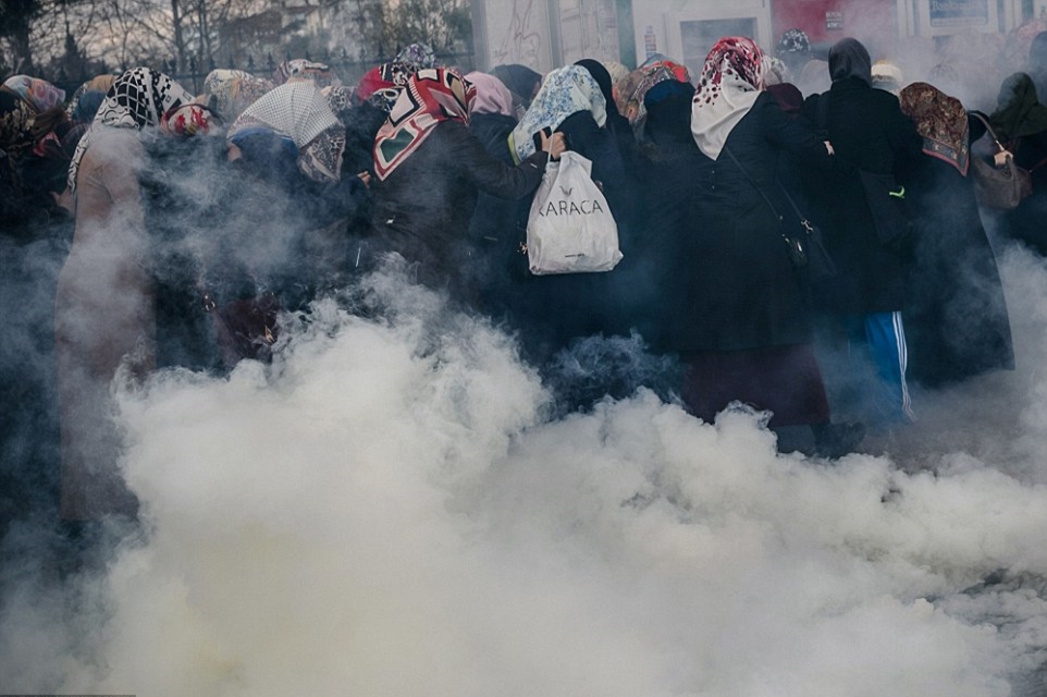 A group of women run from the tear gas fired by Turkish police after officers stormed the headquarters of Zaman daily newspaper last night