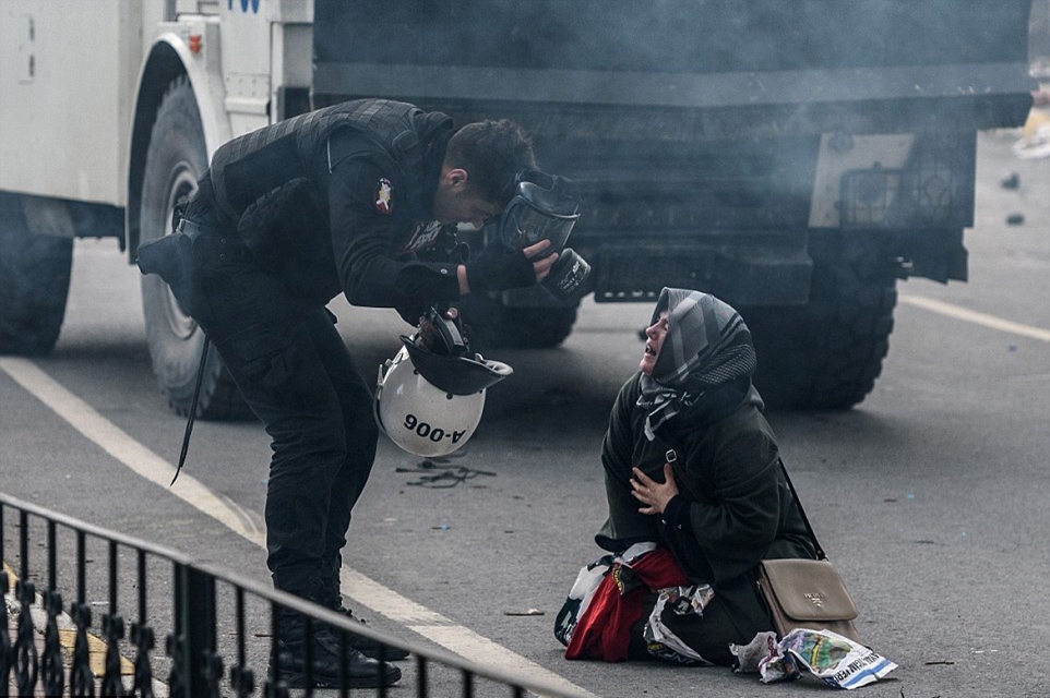 A police officer bends down next to a woman crying in the street as Turkish anti-riot police officers use tear gas to disperse supporters