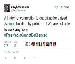 Sevgi Akarcesme, the editor-in-chief of the paper’s English language edition Today’s Zaman, said on Twitter today that the internet connection had been cut in the building.