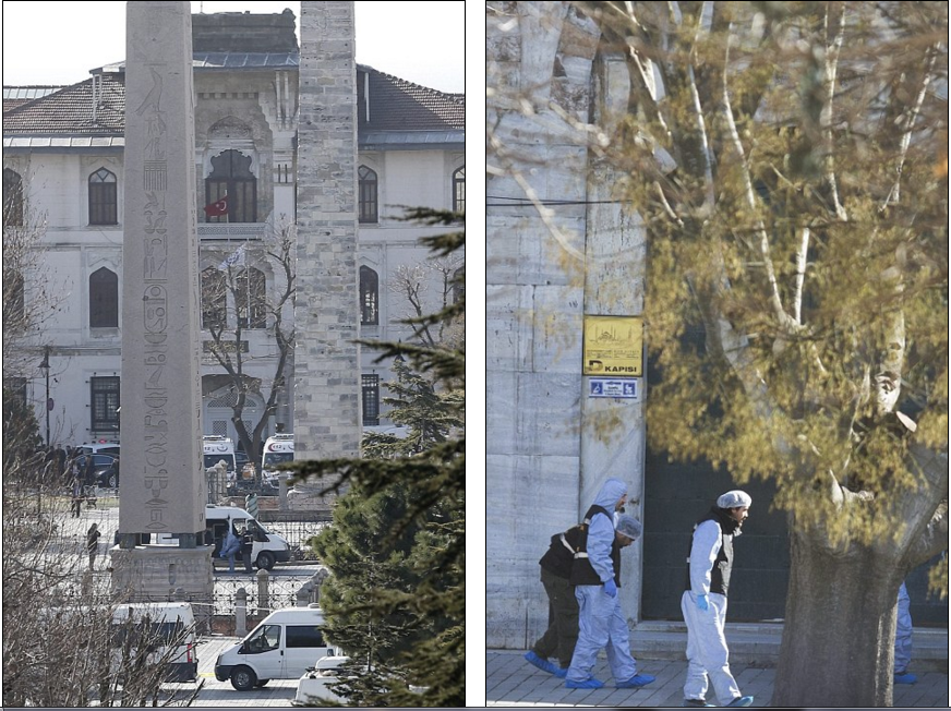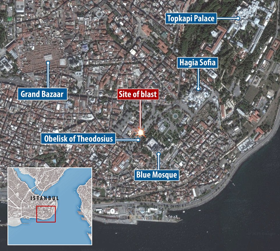 Terror in Turkey: Ten people have died and 15 others were injured when an explosion from a suspected Syrian suicide bomber ripped through a tourism district in the centre of Istanbul near the Obelisk of Theodosius (top right), a monument from ancient Egypt