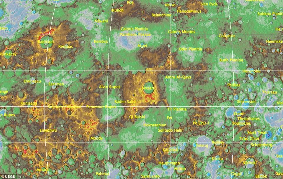 - Map shows its craters, volcanoes and mountains ranges, with some reaching more than 2.5 miles high