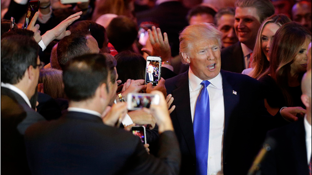 Republican presidential candidate Donald Trump makes his way along a line of supporters before speaking during a primary night news conference, Tuesday, April 26, 2016, in New York. (AP Photo/Julie Jacobson)