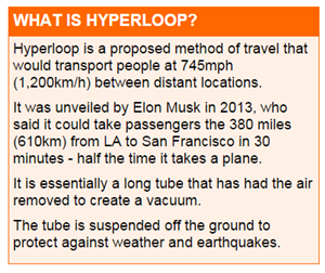 Hyperloop is a long tube that has had the air removed to create a vacuum that hopes to take people from LA to San Francisco in 30 minutes