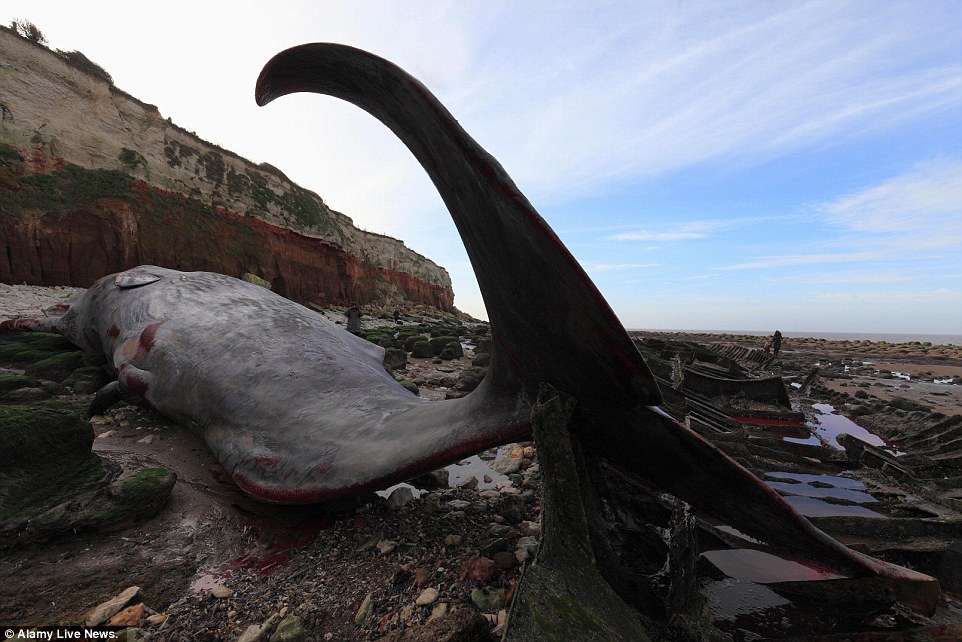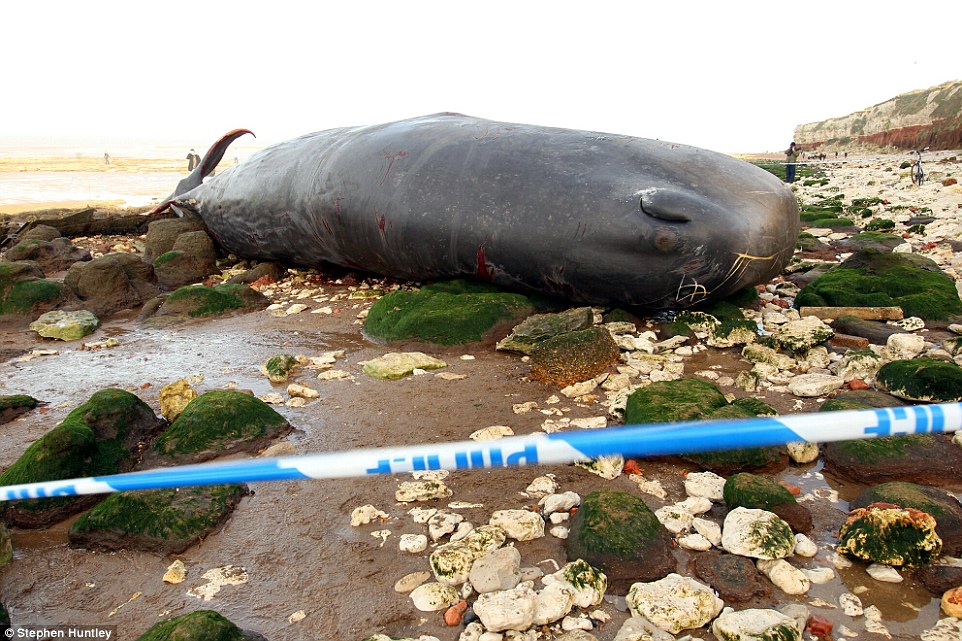 Trapped: The 30-tonne sperm whale, pictured, was washed up on the beach at Hunstanton, in Norfolk, after becoming stranded under cliffs