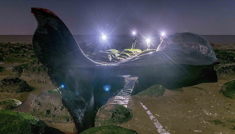 As the tide retreated the whale’s struggles became weaker. First its tail flukes broke the surface, pictured, and then its back was visible