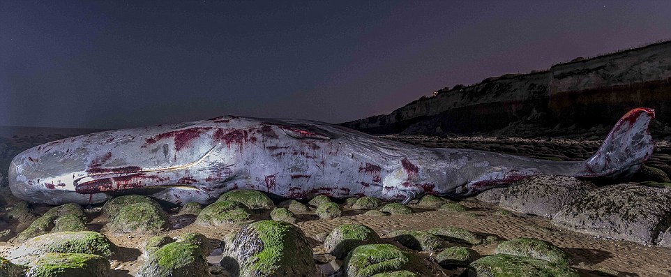 Tragic end of a gentle giant: Huge 45ft sperm whale dies covered in blood on a Norfolk beach after desperately thrashing on rocks