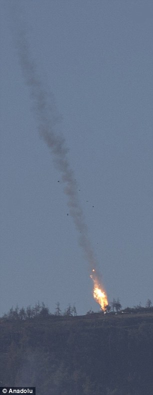 Turkey shoots down RUSSIAN jet for violating its air space: Flaming Su-24 fighter spirals into the ground in Syria where rebels capture one pilot and are hunting the other