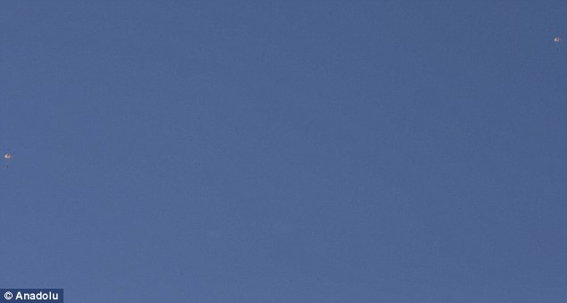 The two pilots can be seen parachuting down far left and far right in this image