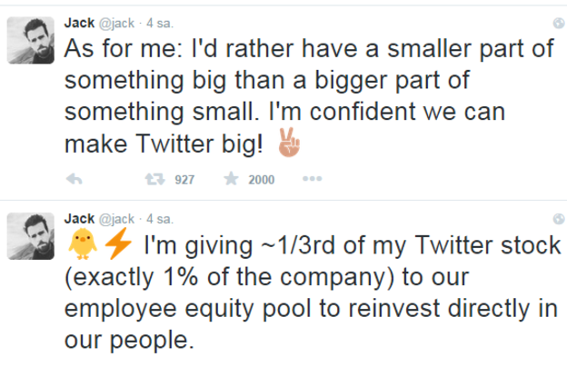 Dorsey, “Ben, daha büyük birşeyin küçük parçası olmayı, küçük bir şeyin daha büyük parçası olmaya tercih ederim. Twitter‘ı büyüteceğimizden eminim!” dedi.