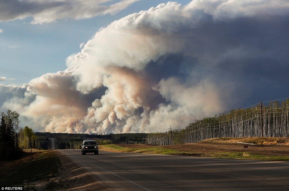 Smoke billows from the wildfires as a truck drives down the highway in Kinosis, Alberta – many residents had to be evacuated twice
