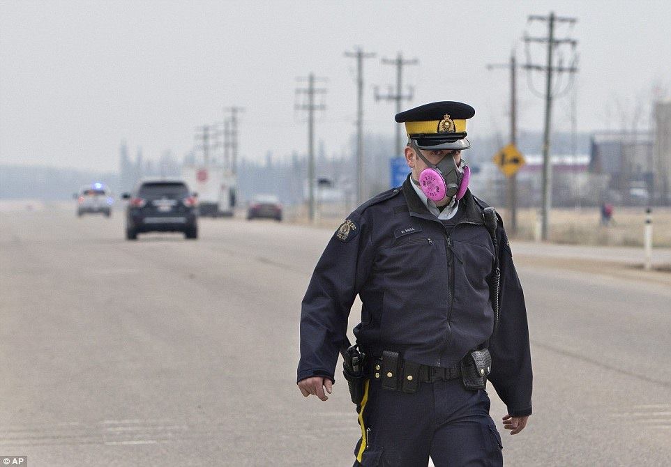 A police officer wears a mask while controlling a roadblock near a wildfire in Fort McMurray