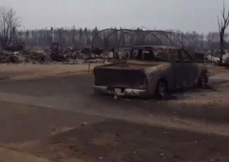 The charred remains of a car in Fort McMurray’s Beacon Hill neighborhood in the eerie footage taken in the wake of the raging inferno