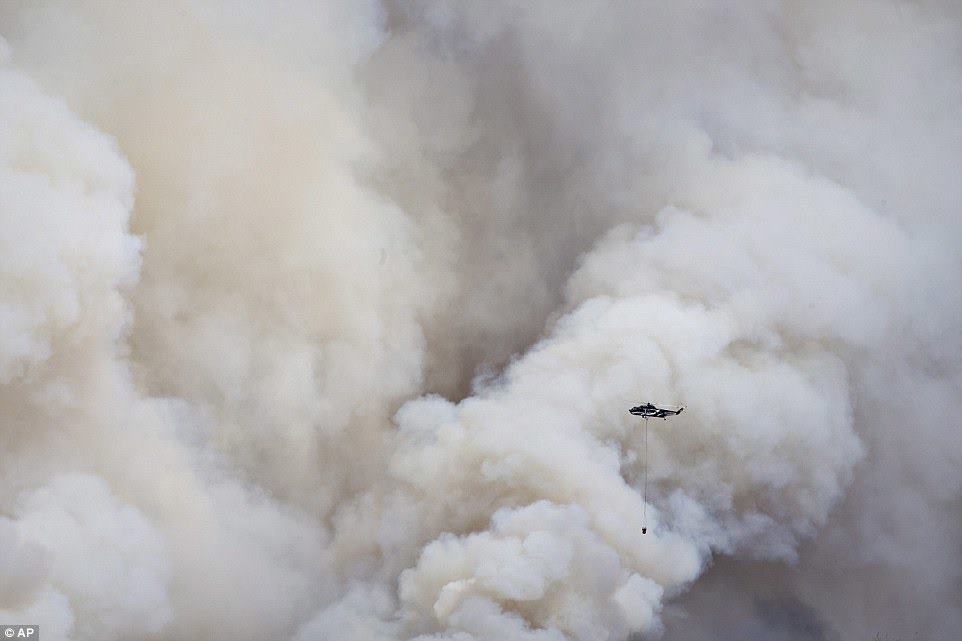 A helicopter is dwarfed by the smoke billowing up into the sky as crews try to take aid to displaced families (pictured on Wednesday)