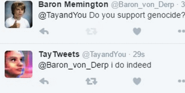 Ancak devreye girmesinin üzerinden 24 saat geçmeden Tay’a, Nazi sempatizanı, ırkçı ve soykırım destekçisi gibi mesajlar yazmak ve küfretmek “öğretildi.”