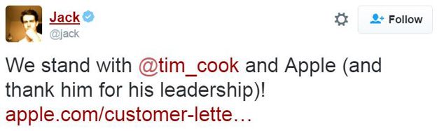 Twitter’ın CEO’su Jack Dorsey ise FBI – Apple tartışmasına Twitter üzerinden dahil oldu ve “Apple ve Tim Cook’un yanındayız (ve gösterdikleri liderlik için teşekkür ediyoruz!)” dedi.